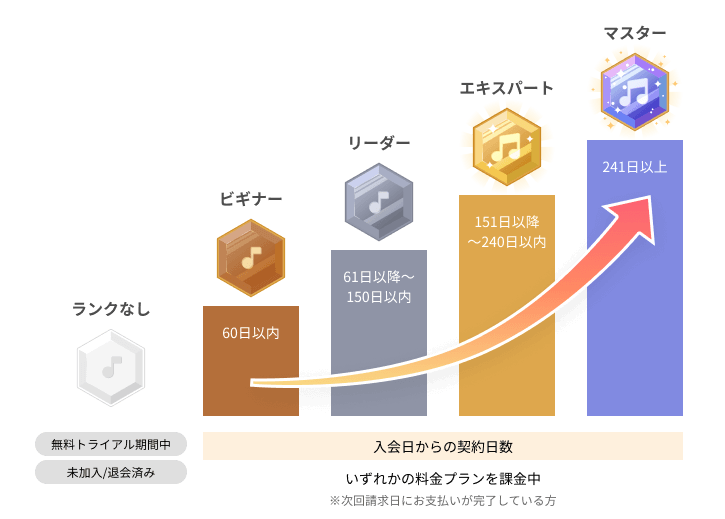 241日以上継続すればマスターランクですが、年額スタンダードプランと年額ライトプランは無料トライアル期間終了後に自動的にマスターランクとなります。